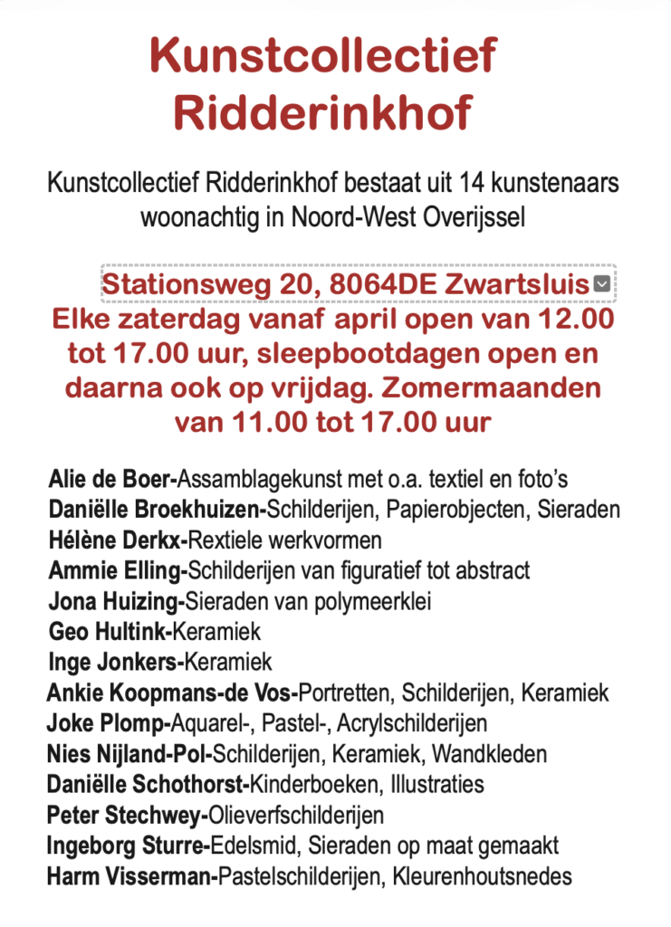 Dit jaar (2026) neem ik met nog 13 andere kunstenaars uit de omgeving, deel aan het Kunstcollectief Ridderinkhof in Zwartsluis. Op het adres Stationsweg 20 is hier een pop-up galerie ingericht in een voormalige schoenenwinkel. De naam van de toenmalige eigenaren is bewaard gebleven. Gedurende de zomermaanden is de galerie open op vrijdag en zaterdag.